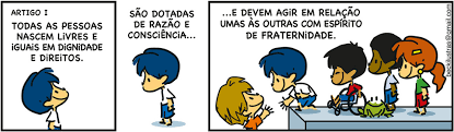 Este importante documento, em seu primeiro artigo, diz que: Todos os seres humanos nascem livres e iguais em dignidade e em direitos. Dotados de razão e de consciência, devem agir uns para com os outros em espírito de fraternidade.